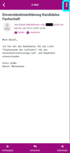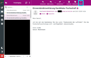 Die Einverständniserklärungen der Kandidierenden können hingegen formlos per E-Mail abgegeben werden. Diese E-Mails müssen lediglich den Listennamen, das Gremium, für welches die Liste eingereicht wird, und den Namen des Kandidierenden enthalten. Hierbei ist wichtig, dass diese von der studentischen E-Mail-Adresse an die vorschlagende Person gesendet werden, und dann gesammelt beim Wahlausschuss eingereicht werden. Diese Einverständniserklärungs-E-Mails müssen vollständig und unverändert (inklusive aller Kopfzeilen) eingereicht werden, damit der Wahlausschuss die Echtheit prüfen kann. Unten finden sich Anleitungen, wie diese Mails in den gängigen Mailprogrammen entsprechend gespeichert werden können.