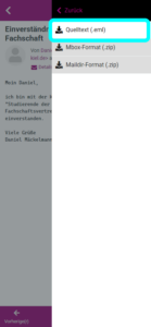 Außerdem kann man auch mehrere Nachrichten auf einmal herunterladen. Dazu wählt man die gewünschten Nachrichten aus (das geht auf Mobilgeräten in der Nachrichtenliste über „⋮“, „Auswahl“, und dann nochmal „Auswahl“ und dann die Auswahl der Checkboxen; Am Computer funktioniert das analog, oder sonst durch die Auswahl weiterer Nachrichten bei gedrückter Strg-Taste) und geht dann, wie oben gezeigt bis zum „Herunterladen“-Menü. Dort wählt man nun „Maildir-Format (.zip)“ aus. Die so erzeugte Datei enthält den Quelltext aller ausgewählten E-Mails.